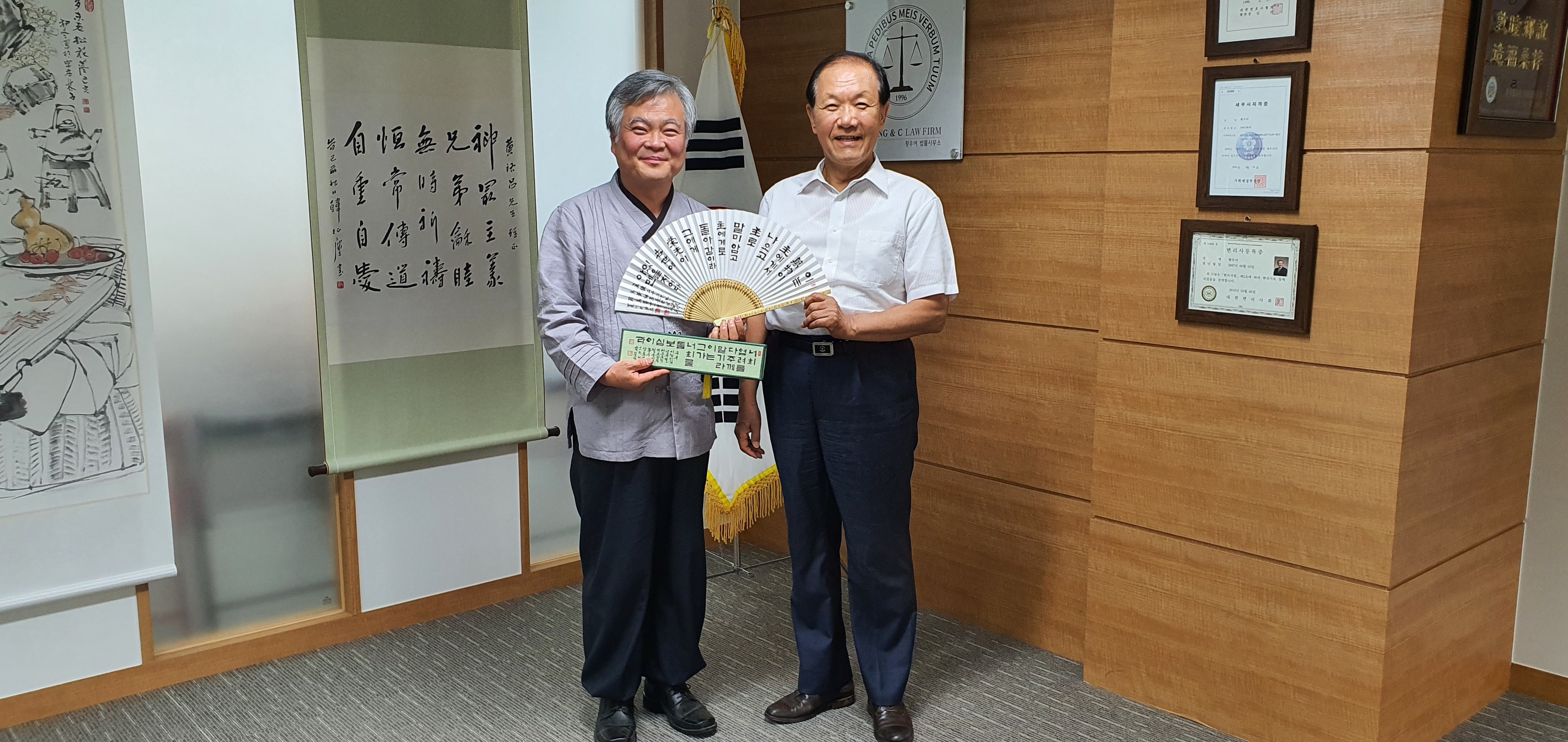 2020년 6월 19일(금) 오후 3시에 사회부총리 겸 교육부장관을 역임하신 황우여 박사님의 초대를 받고 합죽선에 쓴 서예작품을 증정한 후 기념사진을 찍은 본회 이사장 박재성 박사