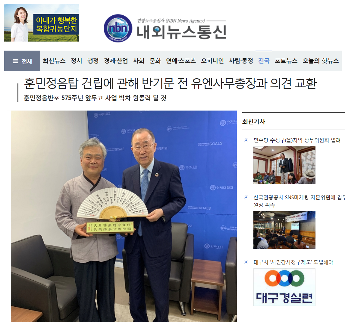 훈민정음탑 건립에 관해 반기문 전 유엔사무총장과 의견 교환