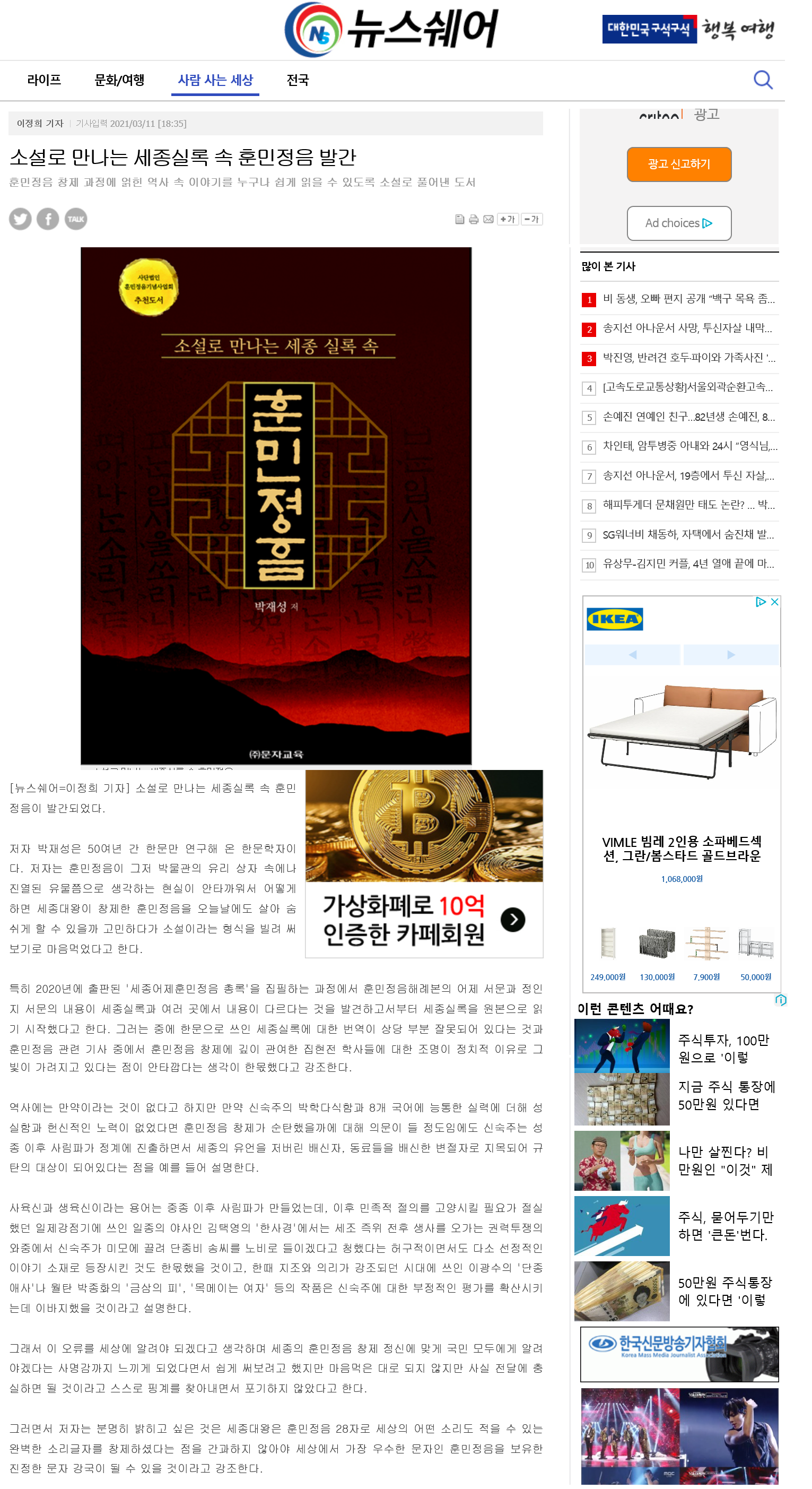 [뉴스쉐어=이정희 기자] 소설로 만나는 세종실록 속 훈민정음이 발간되었다.