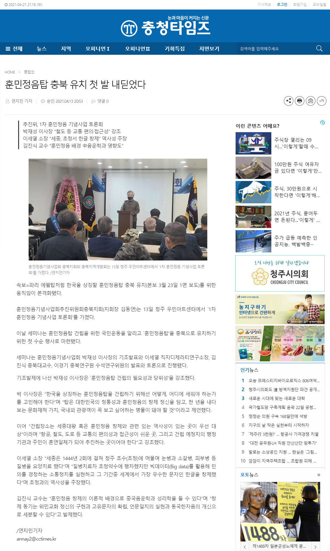 훈민정음탑 충북 유치 첫 발 내딛었다 - 충청타임즈 (cctimes.kr)