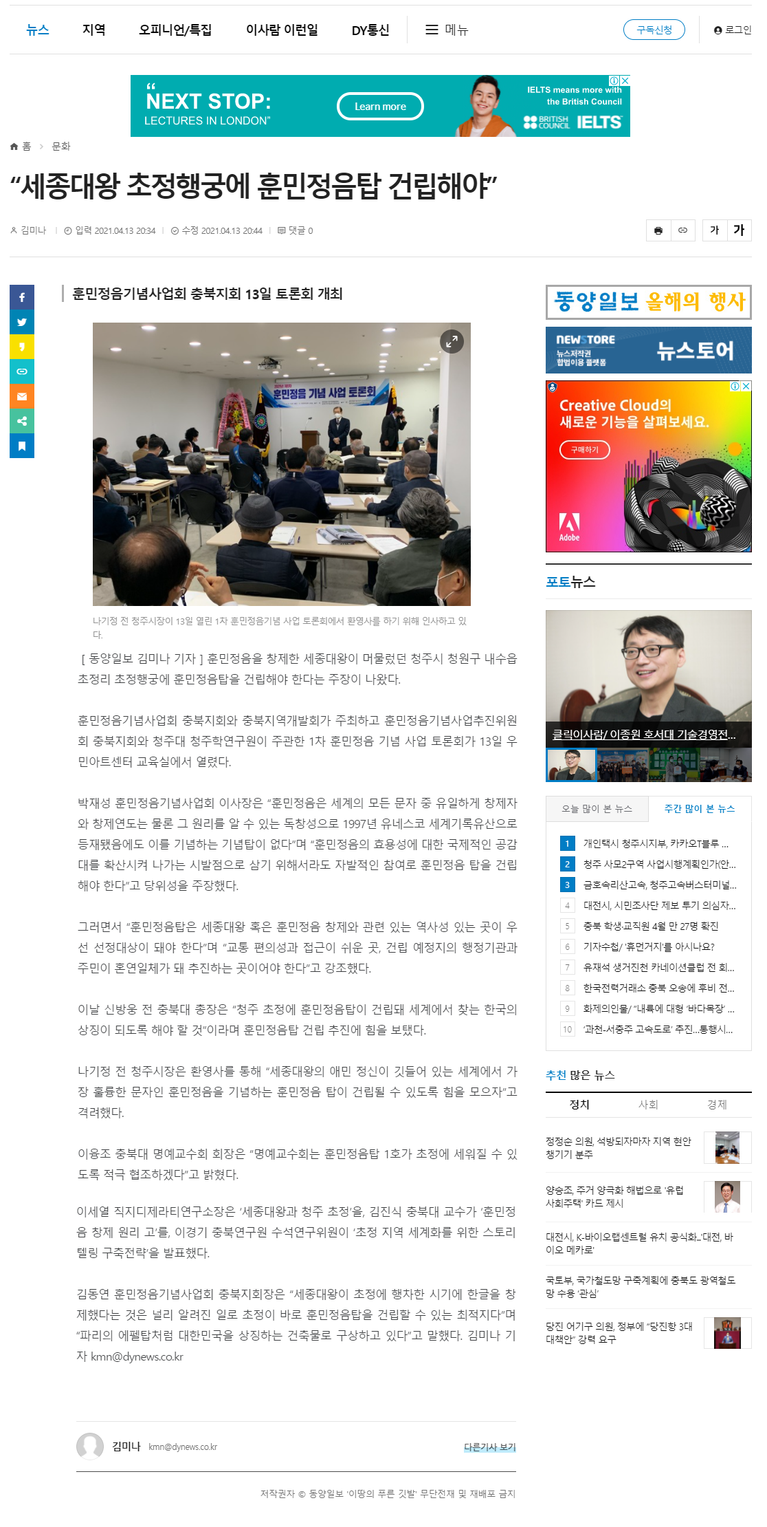 “세종대왕 초정행궁에 훈민정음탑 건립해야”[동양일보]