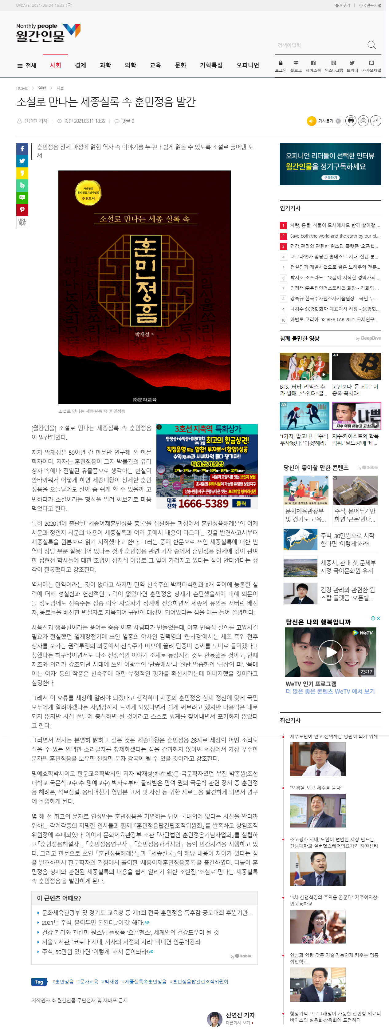 월간인물-소설로 만나는 세종실록 속 훈민정음 발간