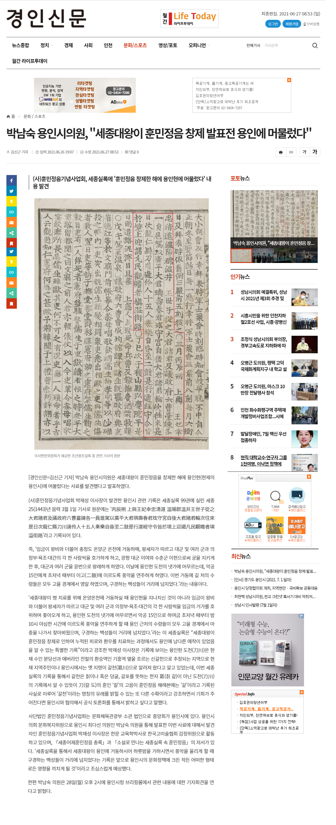 [경인신문] (사)훈민정음기념사업회, 세종실록에 '훈민정음 창제한 해에 용인현에 머물렀다' 내용 발견