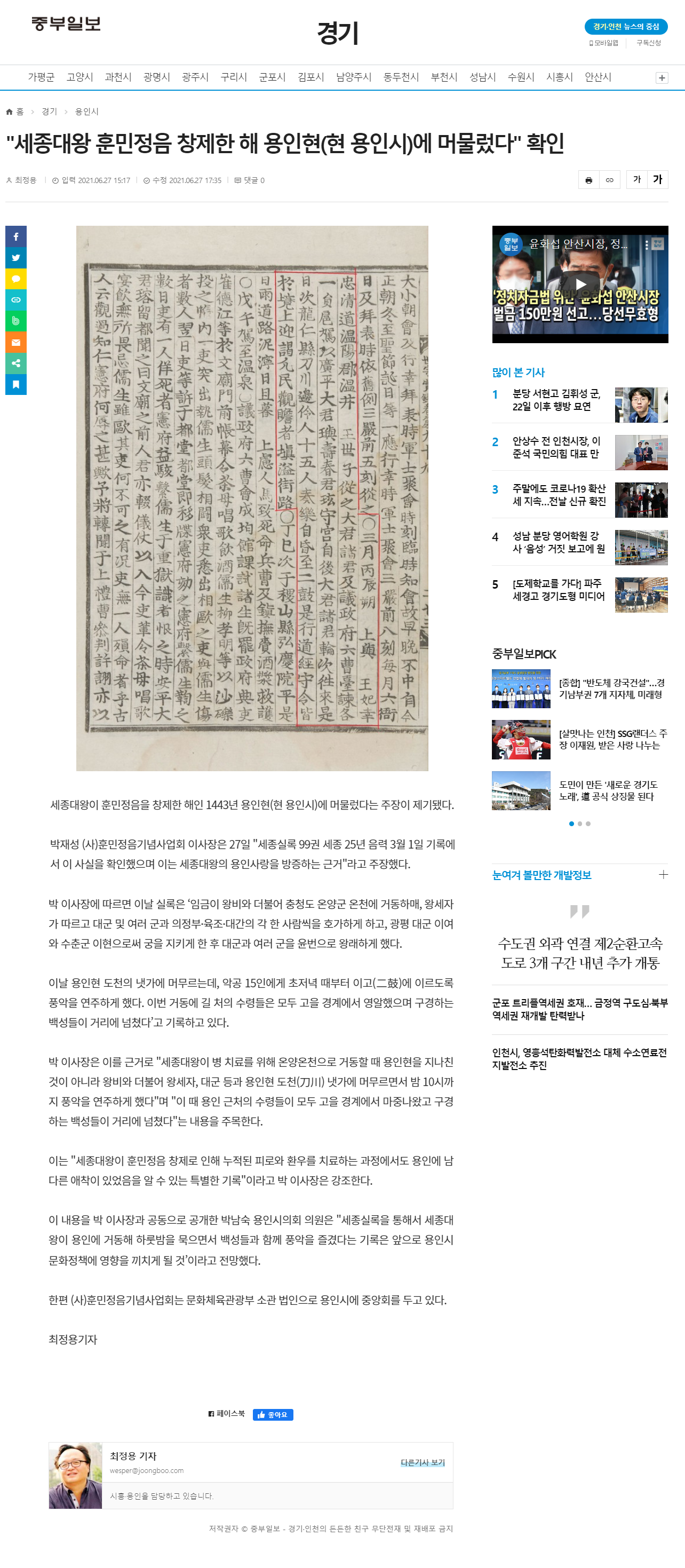 [중부일보] 세종대왕 훈민정음창제한 해 용인현에 머물렀다.