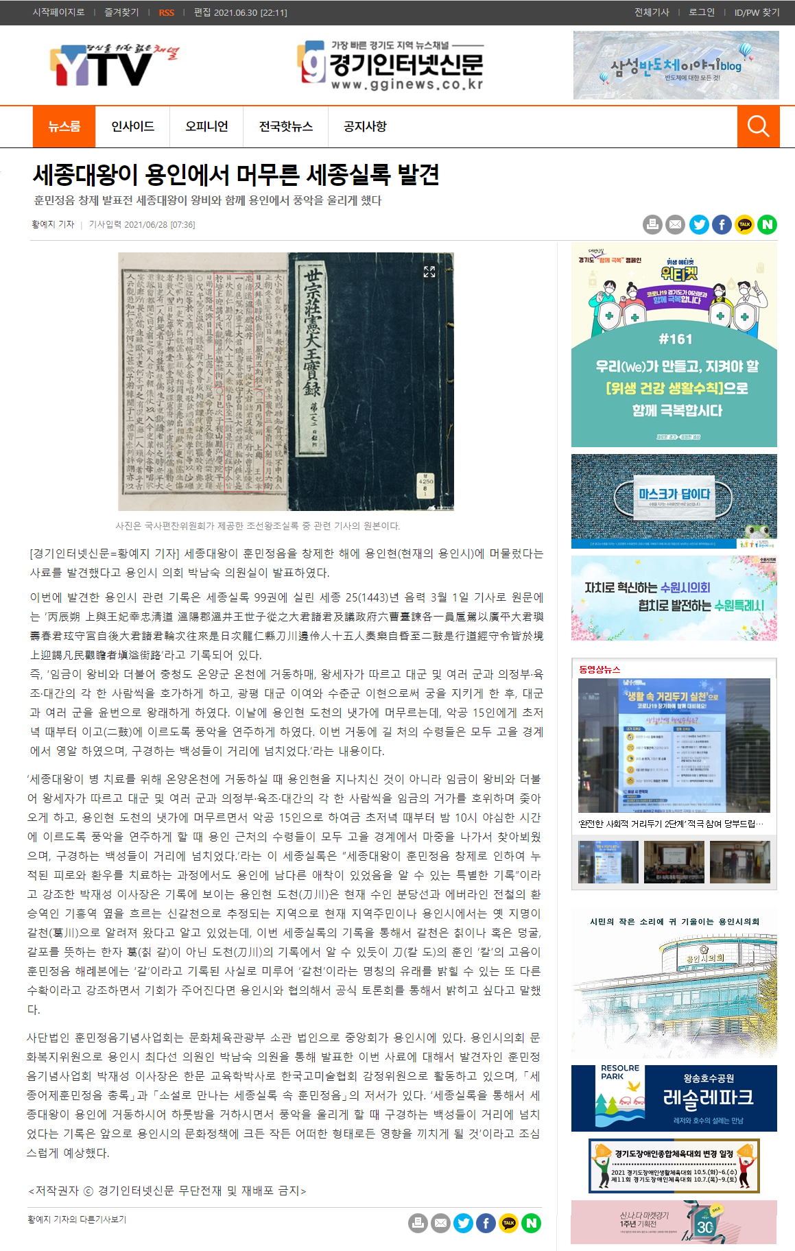 [경인신문]세종대왕이 훈민정음 창제전 왕비와 함께 용인현에서...