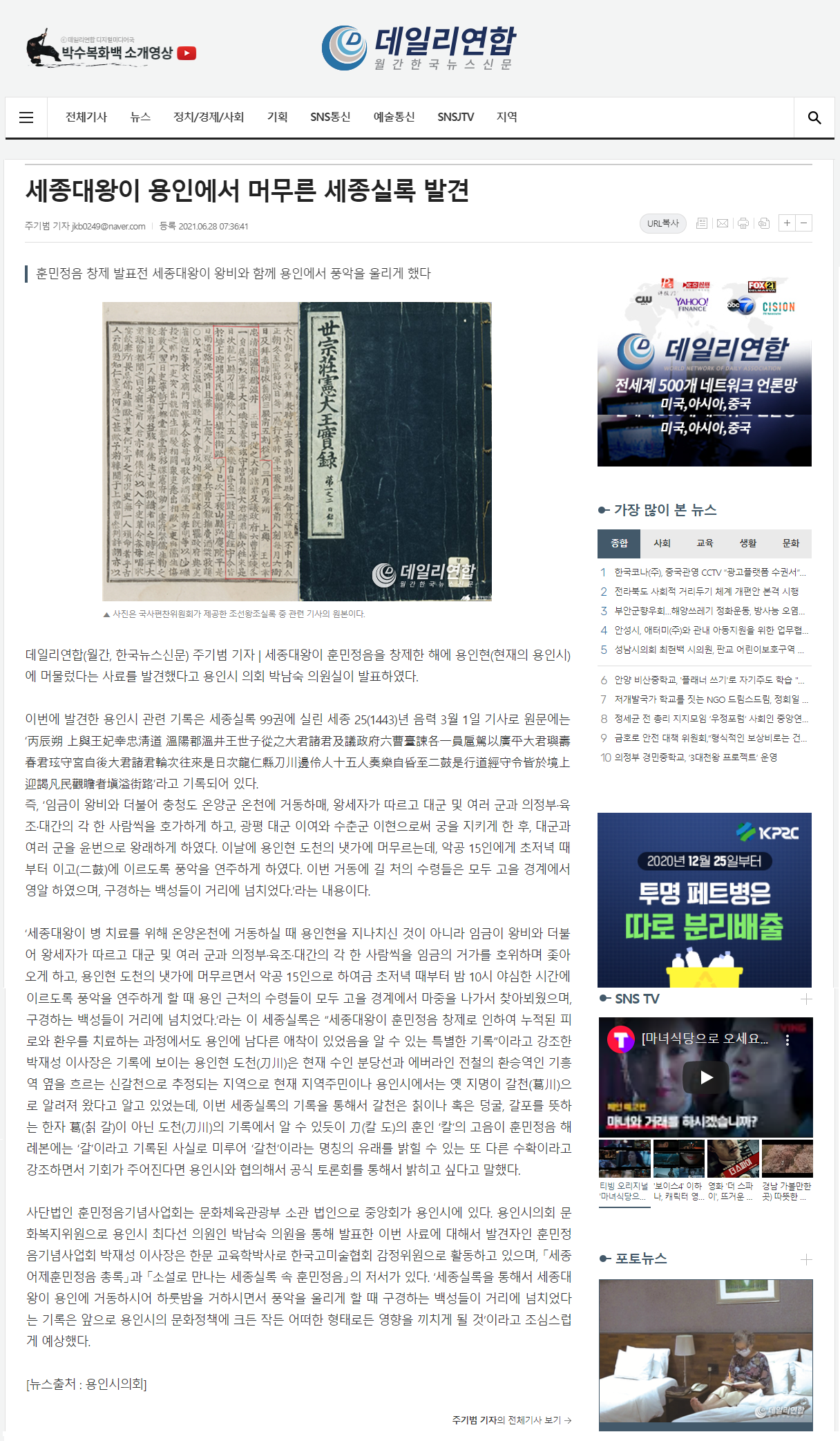 [DiscoveryNews]세종대왕이 용인에서 머무른 세종실록 발견
