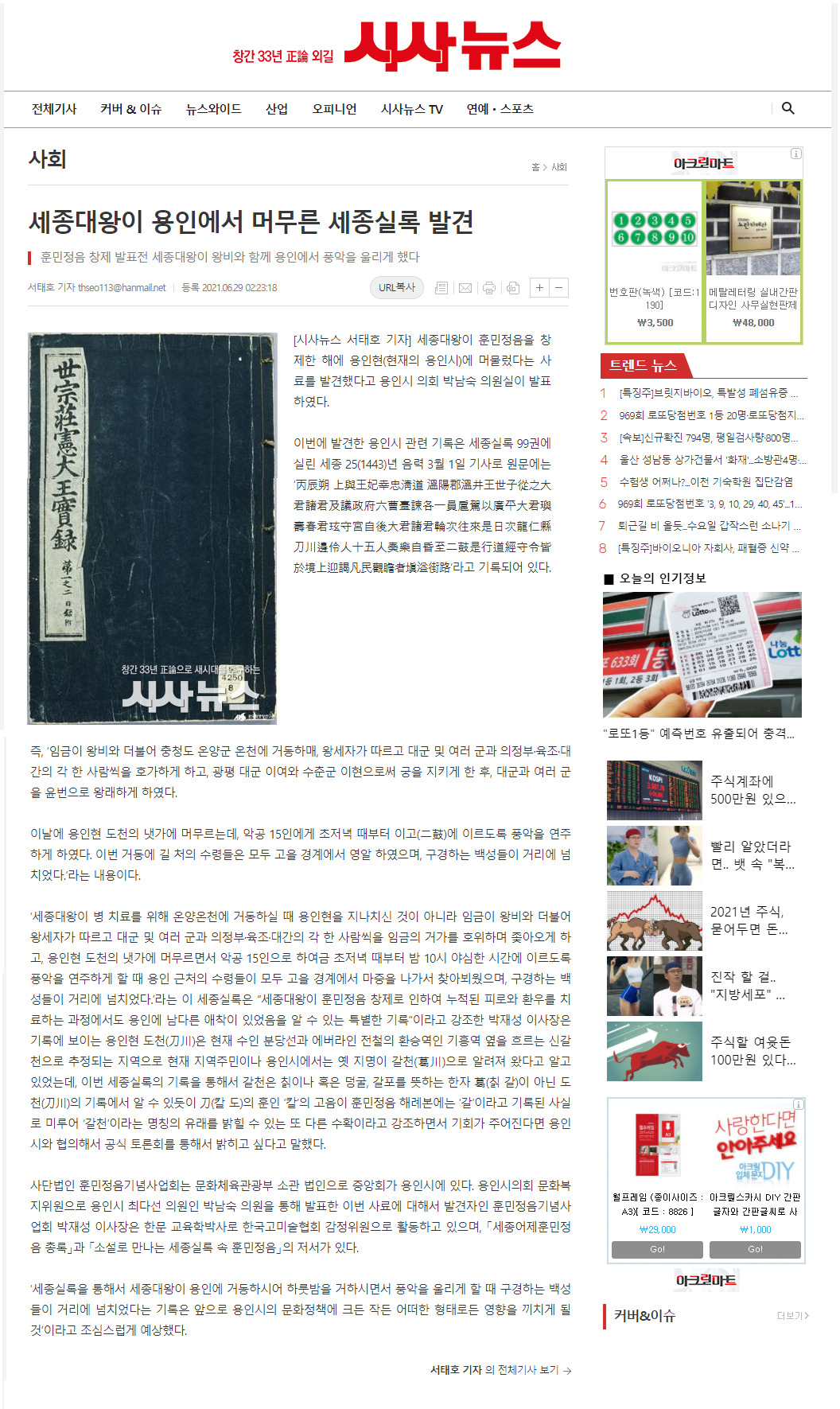 [시사뉴스]세종대왕이 용인에서 머무른 세종실록 발견