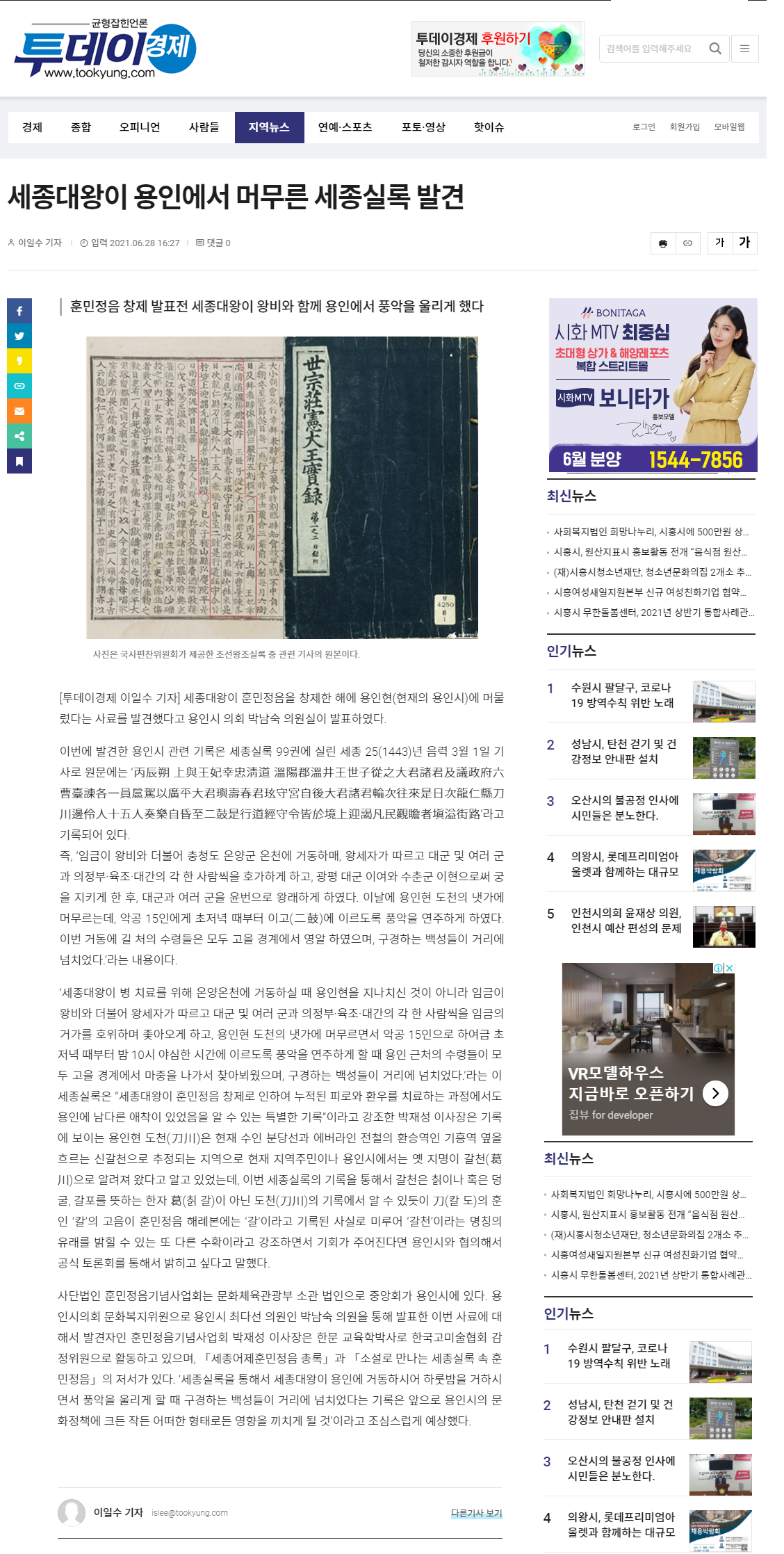 [투데이경제]세종대왕이 용인에서 머무른 세종실록 발견