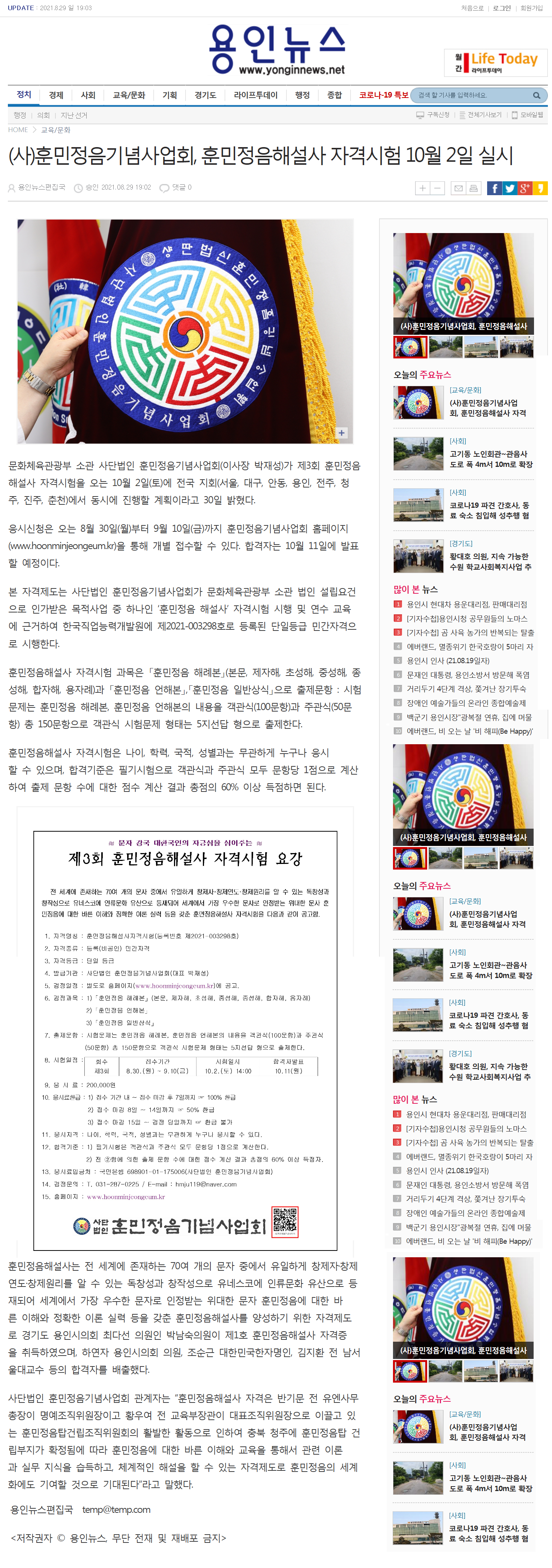 [용인뉴스]제3회 훈민정음해설사 자격시험 시행