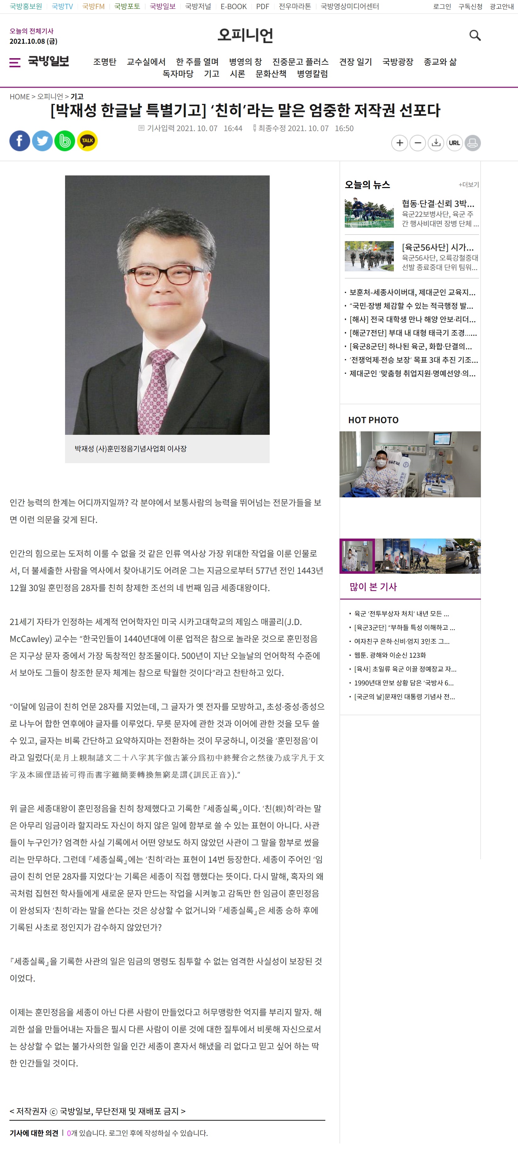 [국방일보] (인터넷판) 박재성 한글날 특별기고