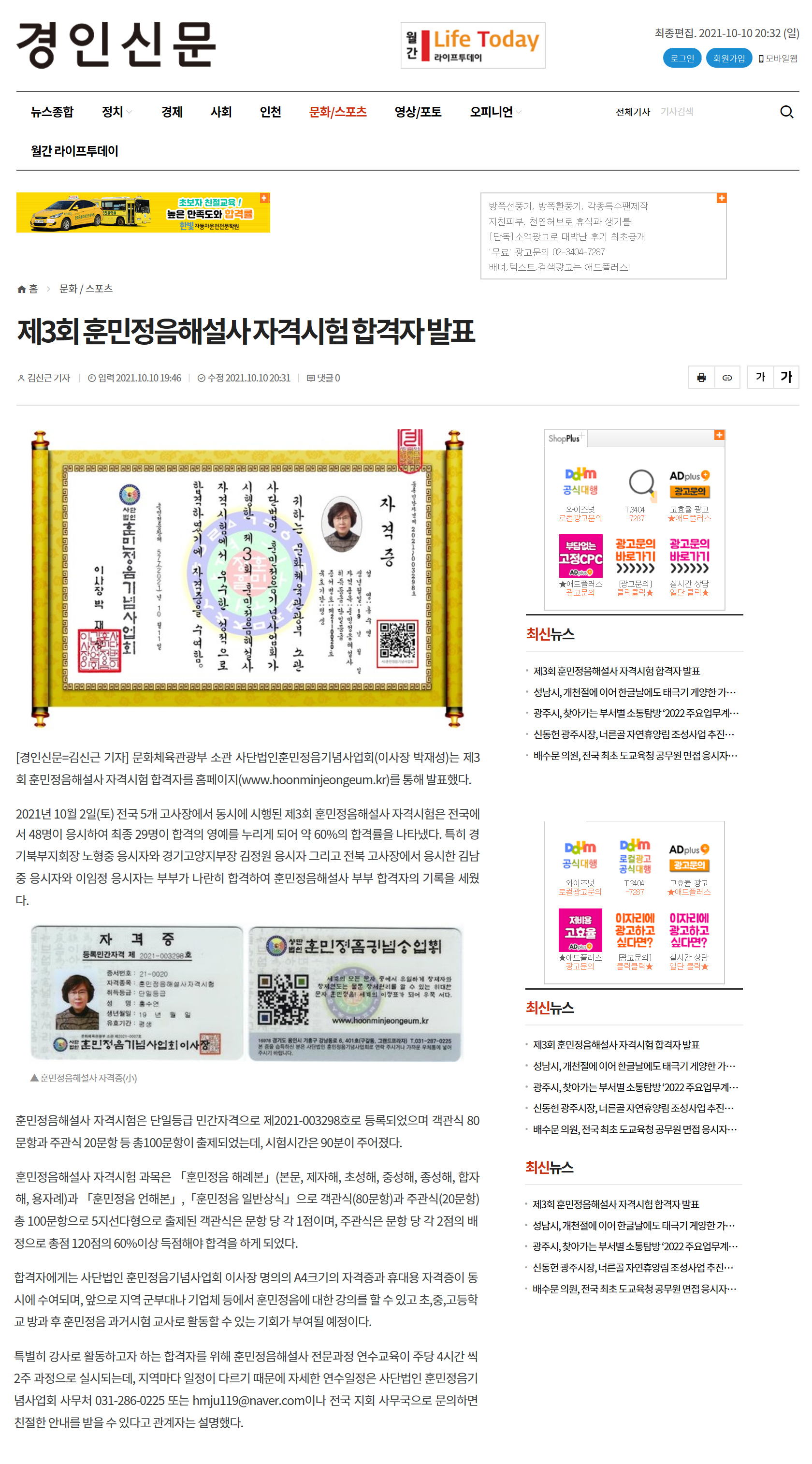 [경인신문] 제3회 훈민정음해설사 자격시험 합격자발표