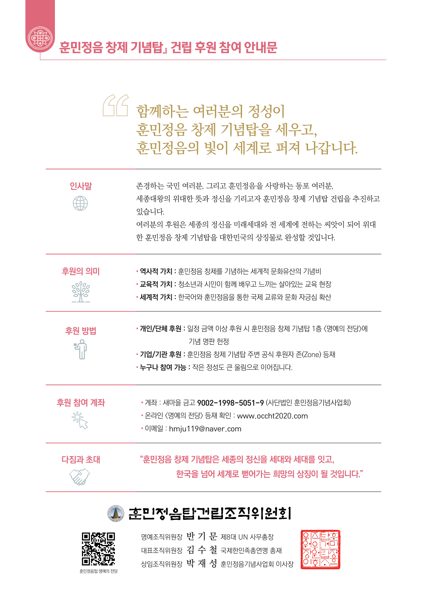 훈민정음 창제 기념탑 건립 후원 참여 안내