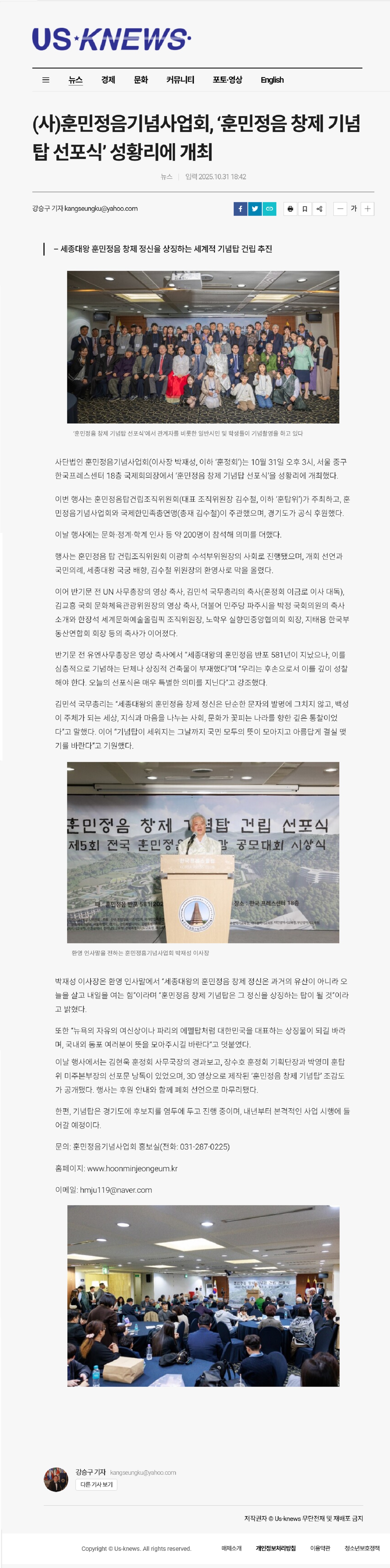 [US*KNEWS](사)훈민정음기념사업회, '훈민정음 창제 기념탑 선포식' 성황리에 개최