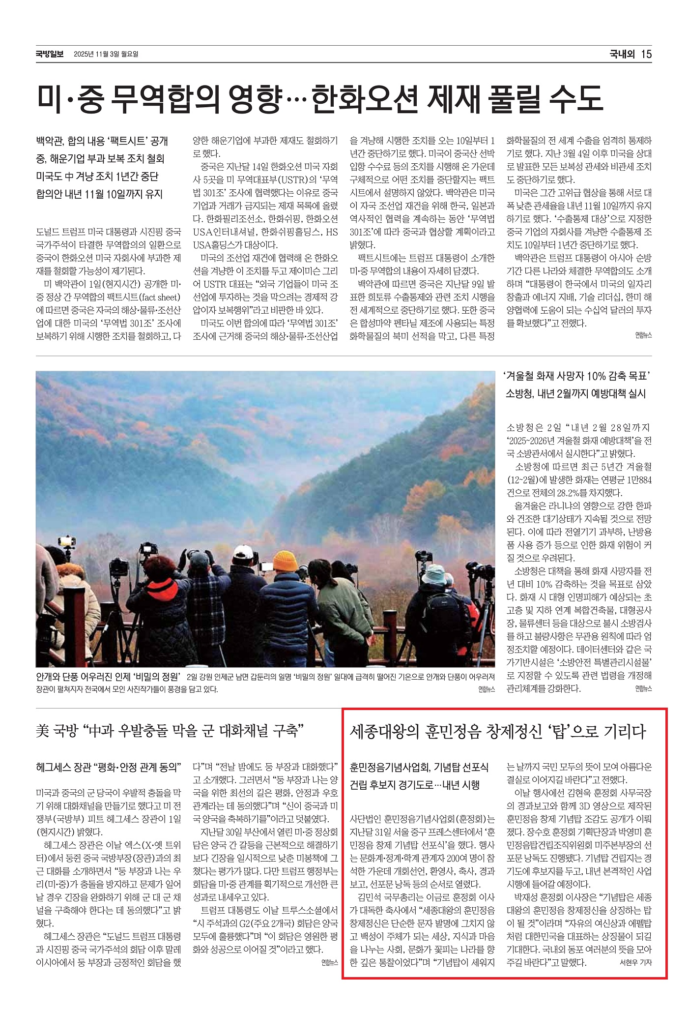 [국방일보] 세종대왕의 훈민정음 창제정신 '탑'으로 기리다