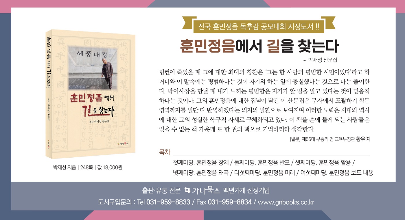 박재성의 『훈민정음에서 길을 찾는다』는 크게 6부로 나누어져 있으며 주옥같은 작품을 만나볼 수 있는 책이다.