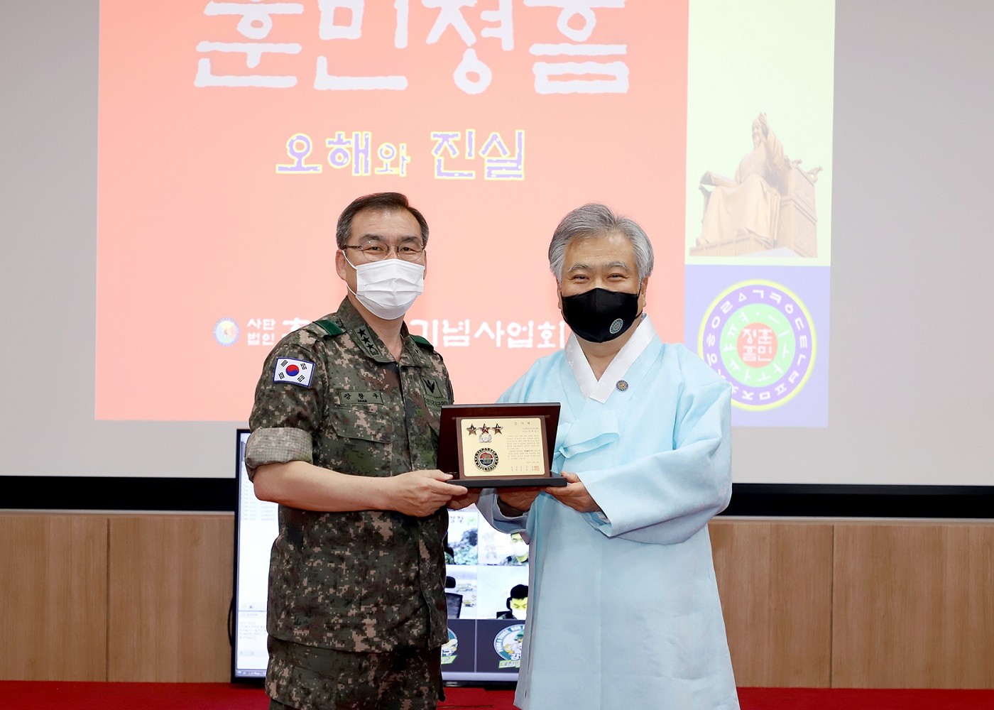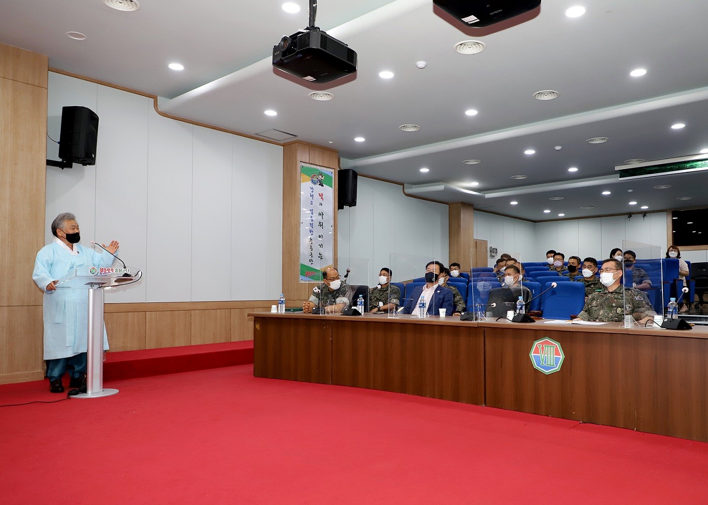 2021년 6월 16일(수) 사단법인 훈민정음기념사업회 박재성 이사장은 위풍당당 충용군단 제8군단장 강창구 중장의 초청을 받아서 8군단 소속 고급장교 45명을 대상으로 안보특강 '훈민정음 오해와 진실'에 대해서 오전 10시부터 11시 30분까지 실시하였다.
