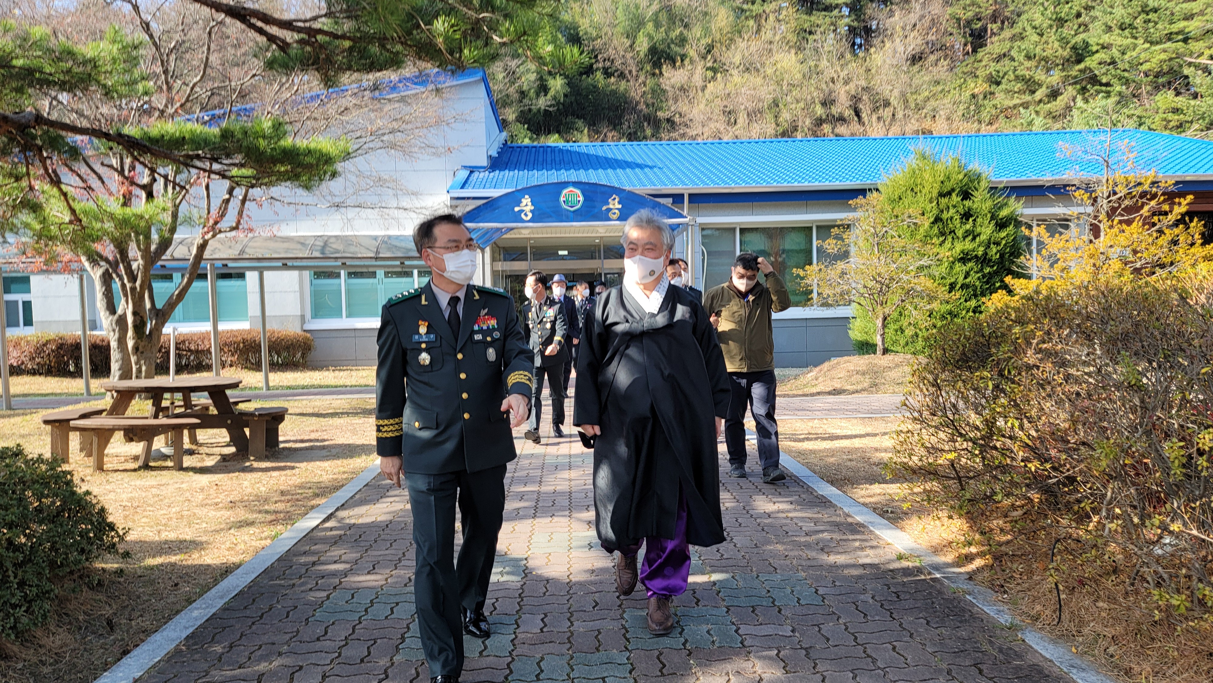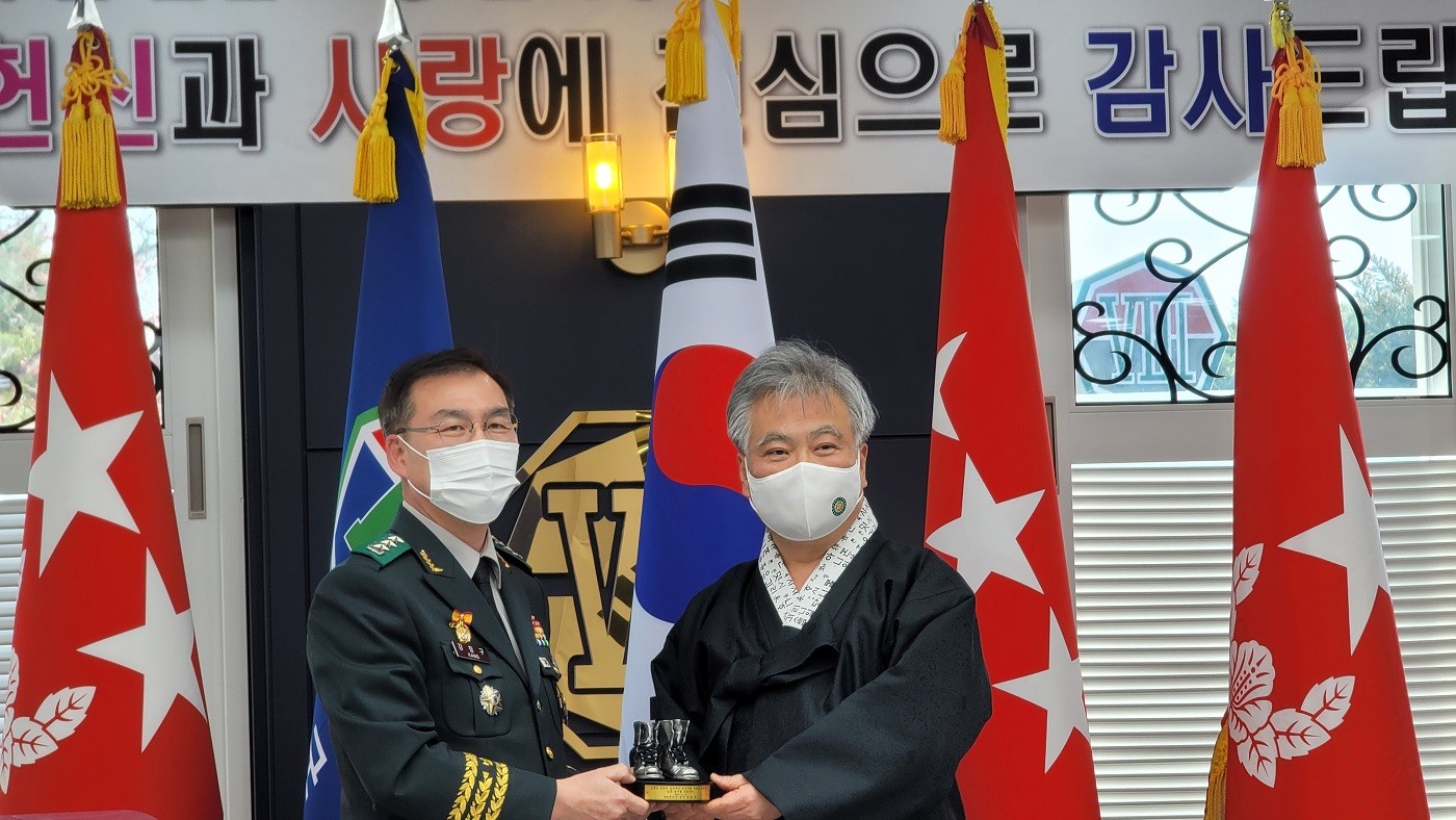 2021년 11월 25일(목) 오전 11시 30분 육군 제8군단장 강창구 중장 초청을 받고 8군단을 방문한 사단법인 훈민정음기념사업회 박재성 이사장은 강창구 군단장으로부터 감사패를 받고 병사들의 피복 및 전투식량 등에 대해서 군단장으로부터 설명을 들었다.