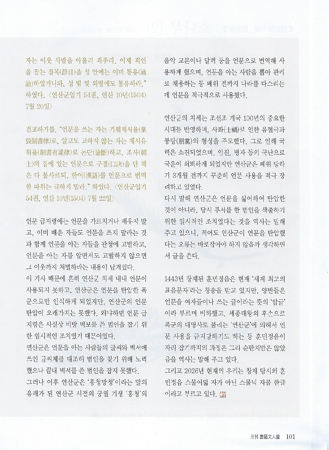 [월간서예문인화] 연산군 언문 탄압의 전모