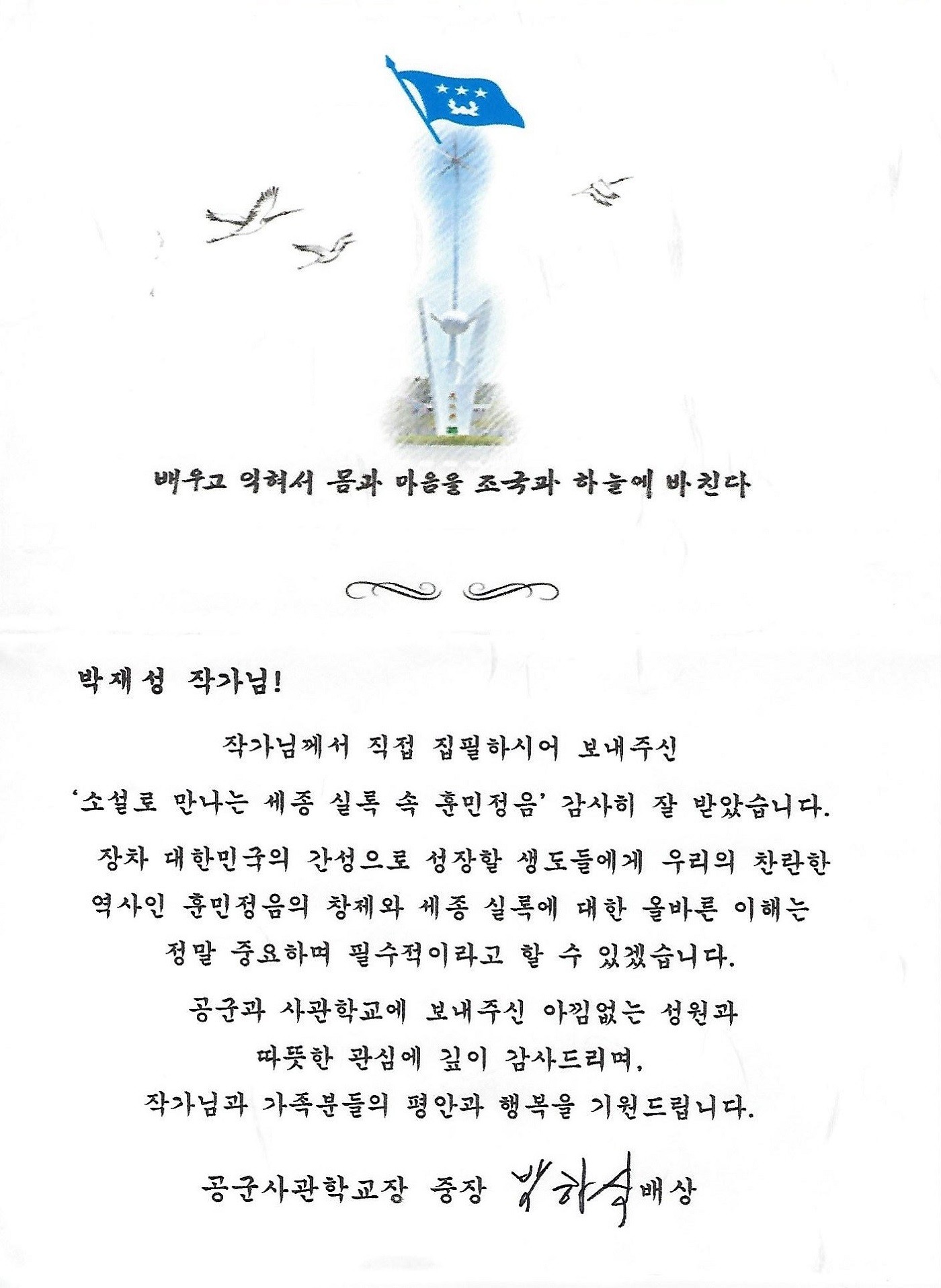 2022년 4월 20일, 대한민국 공군 참모총장 박하식 중장으로부터 훈민정음의 가치 확산과 장병 인성 및 정신전력 함양에 기여한 공로에 대한 감사편지를 수취하였다.