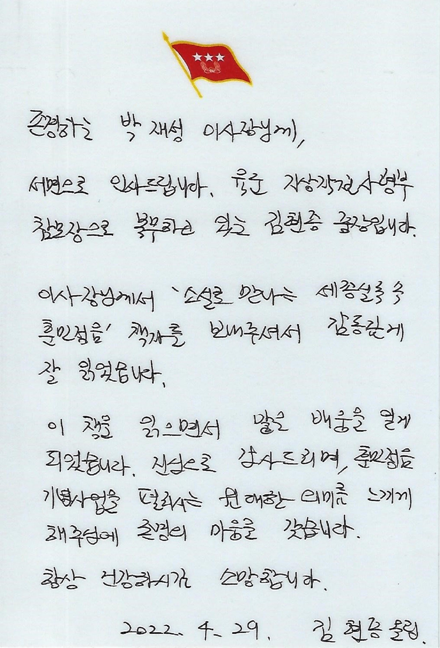 2022년 4월 29일, 지상작전사령부 참모장 김현종 중장으로부터 군 장병 대상 교육 및 정신전력 강화 활동에 대한 감사 편지를 수취하였다.