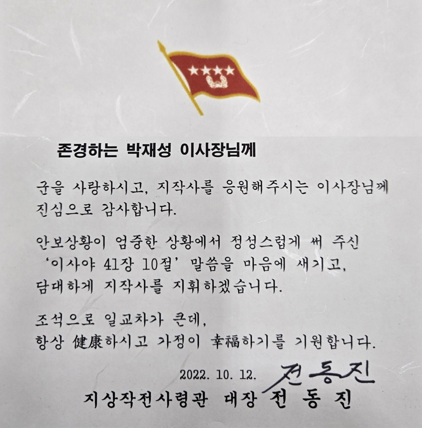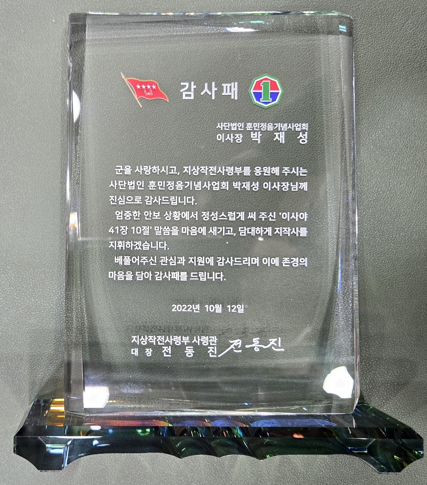 지상작전사령부 사령관 감사패 및 감사편지
