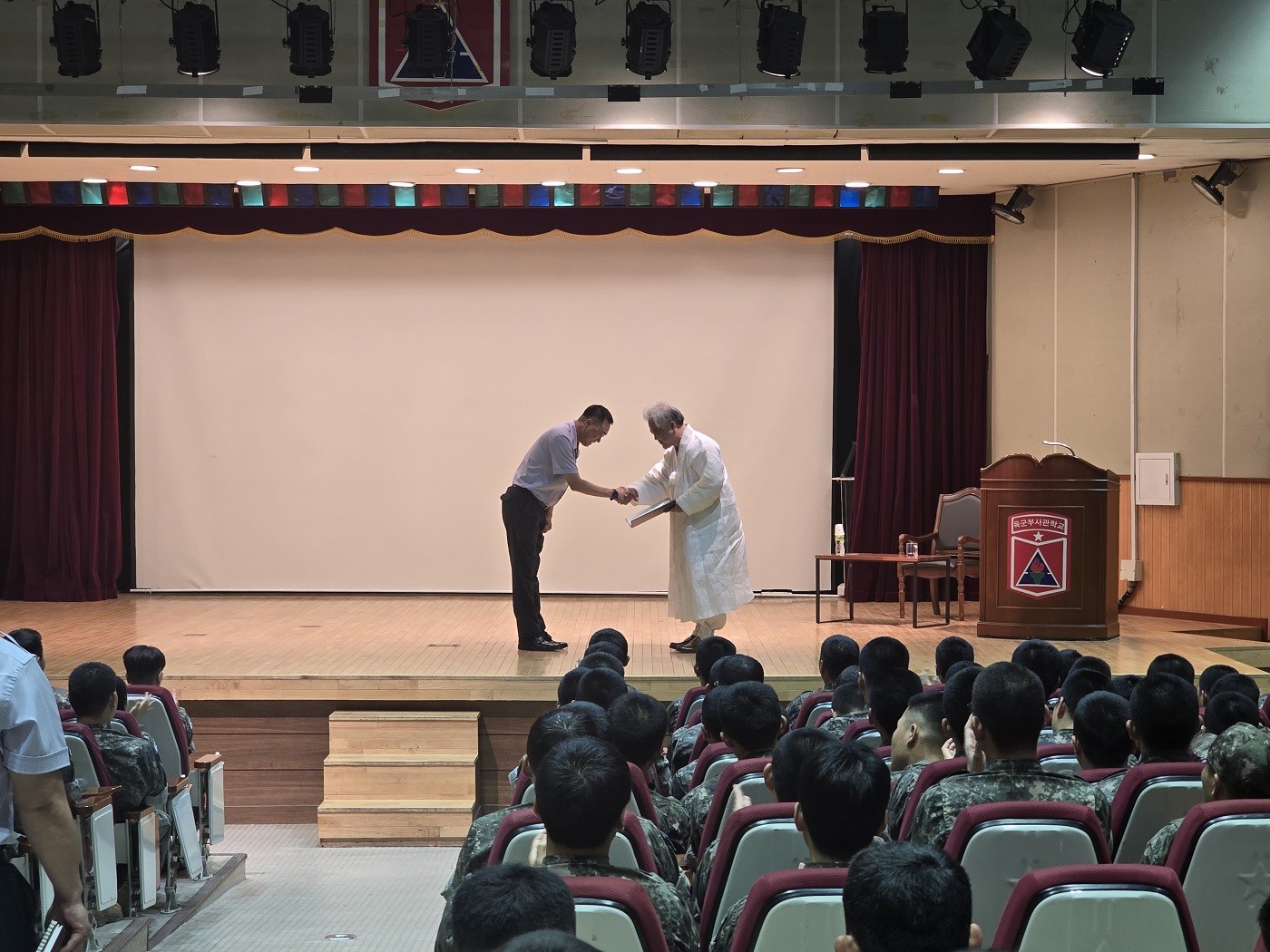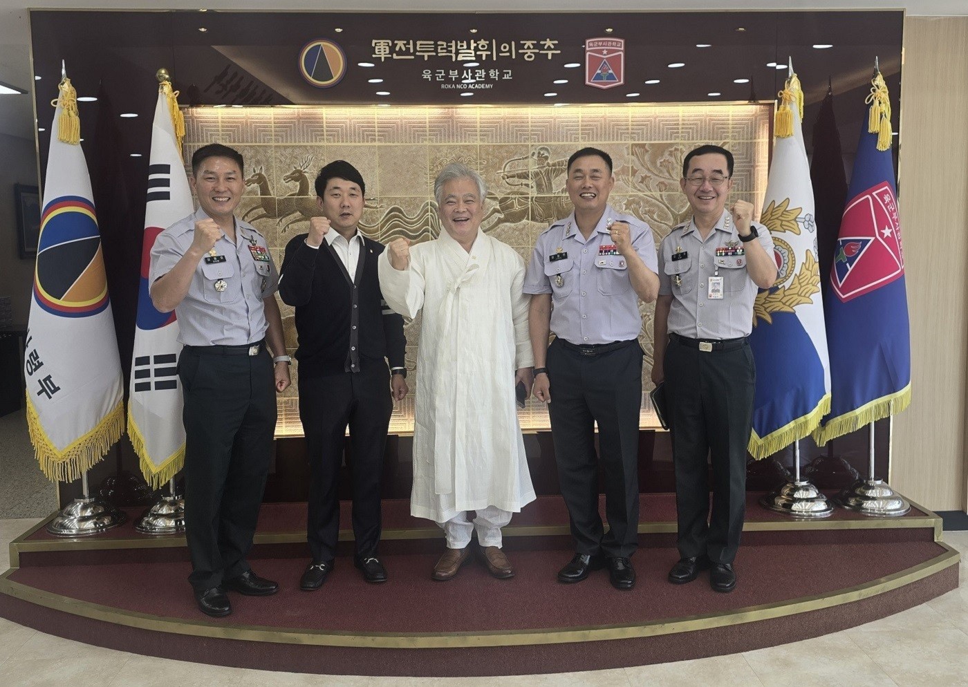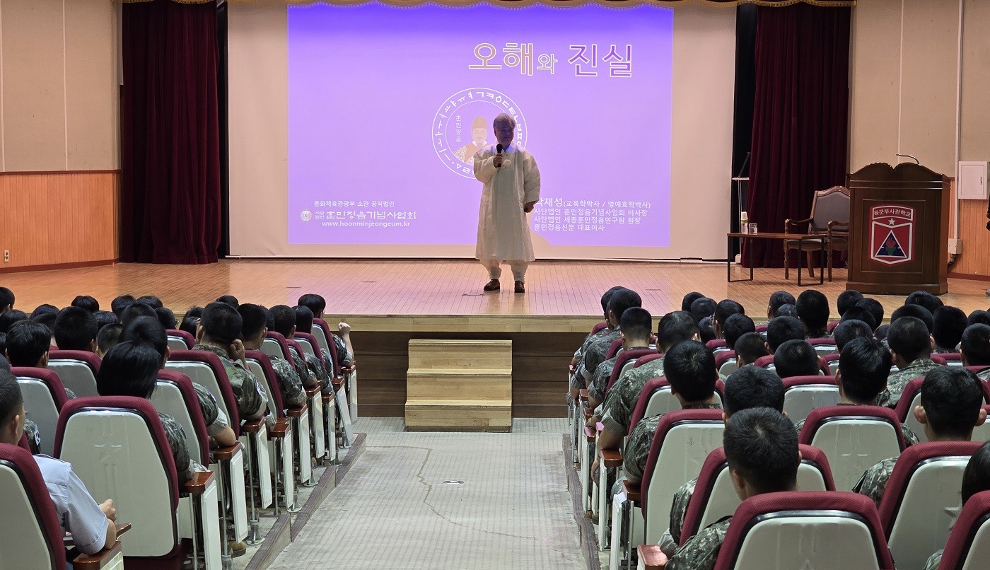 2025년 7월 28일(월) 오전 10시부터 12시까지, 사단법인 훈민정음기념사업회 박재성 이사장은 전북 익산에 위치한 육군부사관학교의 초청을 받아 부사관 교육생 200명을 대상으로 「훈민정음의 오해와 진실」을 주제로 특강을 진행하였다. 이번 특강은 김경중 소장(학교장)의 초청으로 이루어졌으며, 병가 중인 김경중 소장을 대신하여 참모장 장철민 대령, 교수부장 김상우 대령, 심광호 주임원사가 환영과 안내를 맡았다.