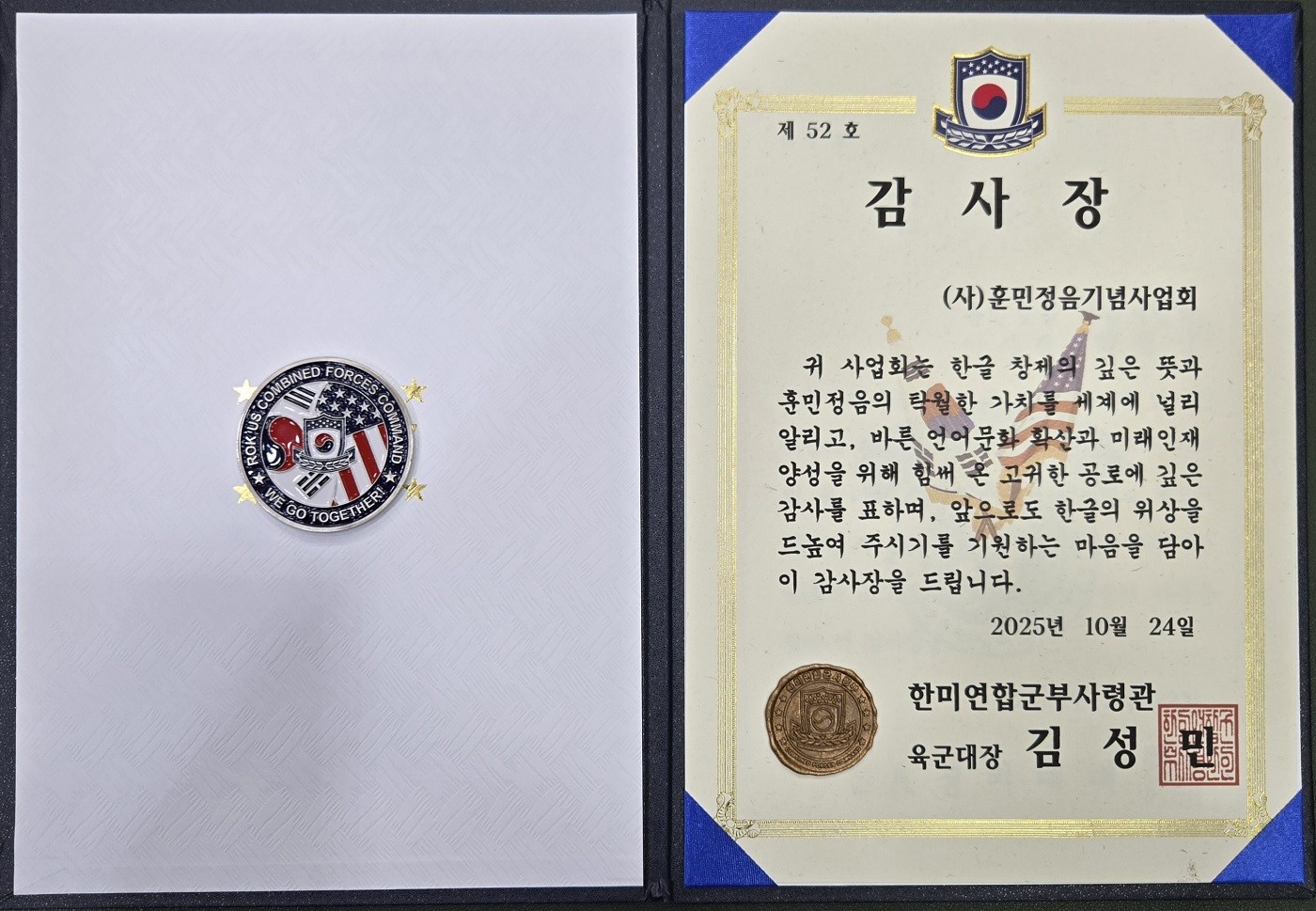 김 부사령관은 “훈민정음의 창제 정신과 인류 문화유산적 가치를 세계에 드높이고, 바른 언어문화 확산과 미래 인재 양성에 헌신해 오신 이사장님의 노고에 깊은 경의를 표합니다. 훈민정음기념사업회의 무궁한 발전을 기원합니다.” 라는 메시지와 함께 감사패를 전달하였다. 이에 박재성 이사장은 김성민 부사령관의 취임을 축하하며 기념 도자기와 훈민정음 코인을 증정하였다.
