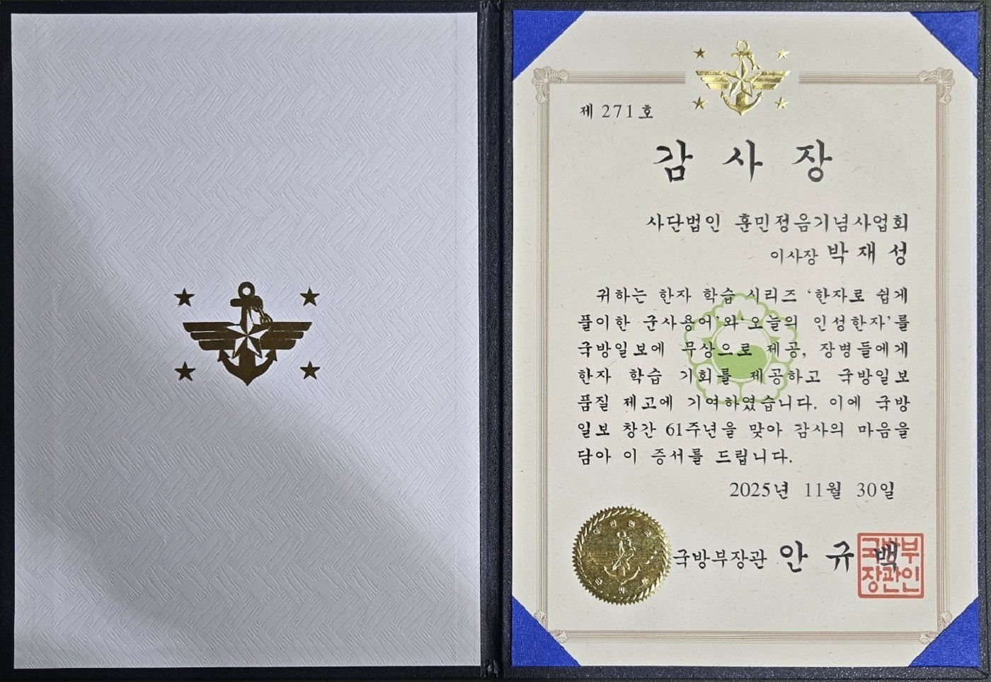 2025년 11월 30일, 사단법인 훈민정음기념사업회는 국방부 장관 안규백으로부터 훈민정음의 역사적 가치 확산과 군 정신전력 함양에 기여한 공로를 인정받아 감사장과 국방장관 상징 코인을 수여 받았다.