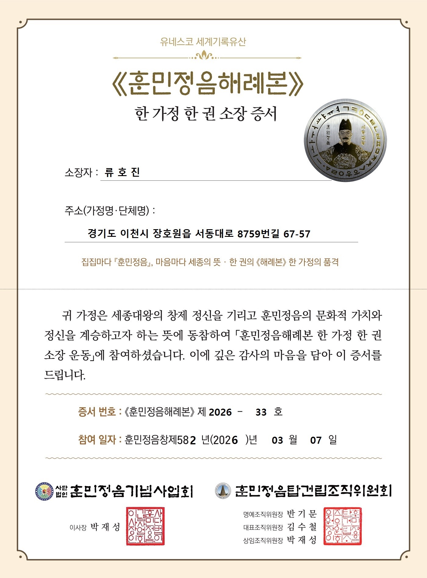 《해례본》 33호 소장자 류호진 즐거운미래 대표이사 가족