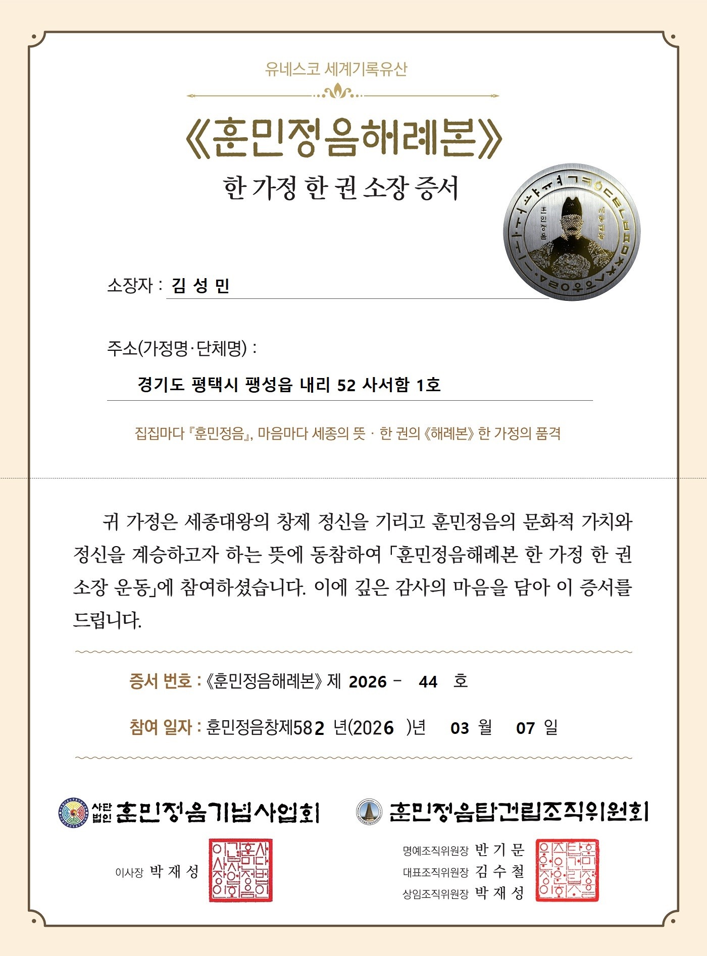 《해례본》 44호 소장자 김성민 한미연합사령부 부사령관 가족