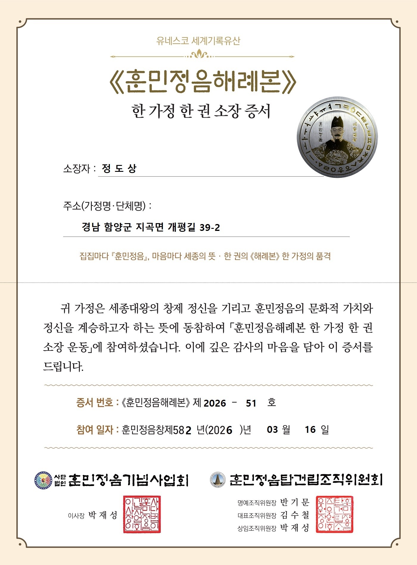 《해례본》 51호 소장자 정도상 가족